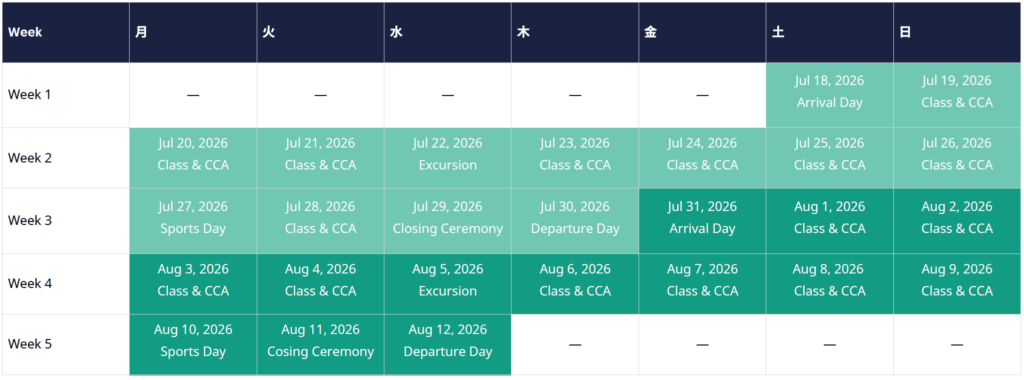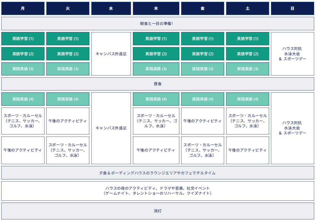 本プログラムは、両方のキャンプに参加される生徒たちが、学習・アクティビティ・生活面のケアにおいて⼀切の中断を感じることなく、スムーズに移行できるよう綿密に設計されています。2回続けて参加しても内容が重複することはありません。